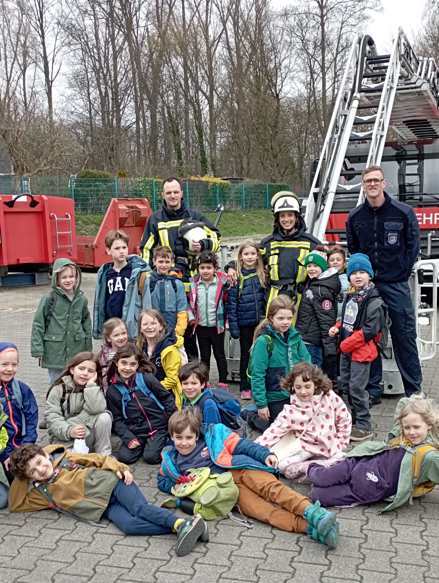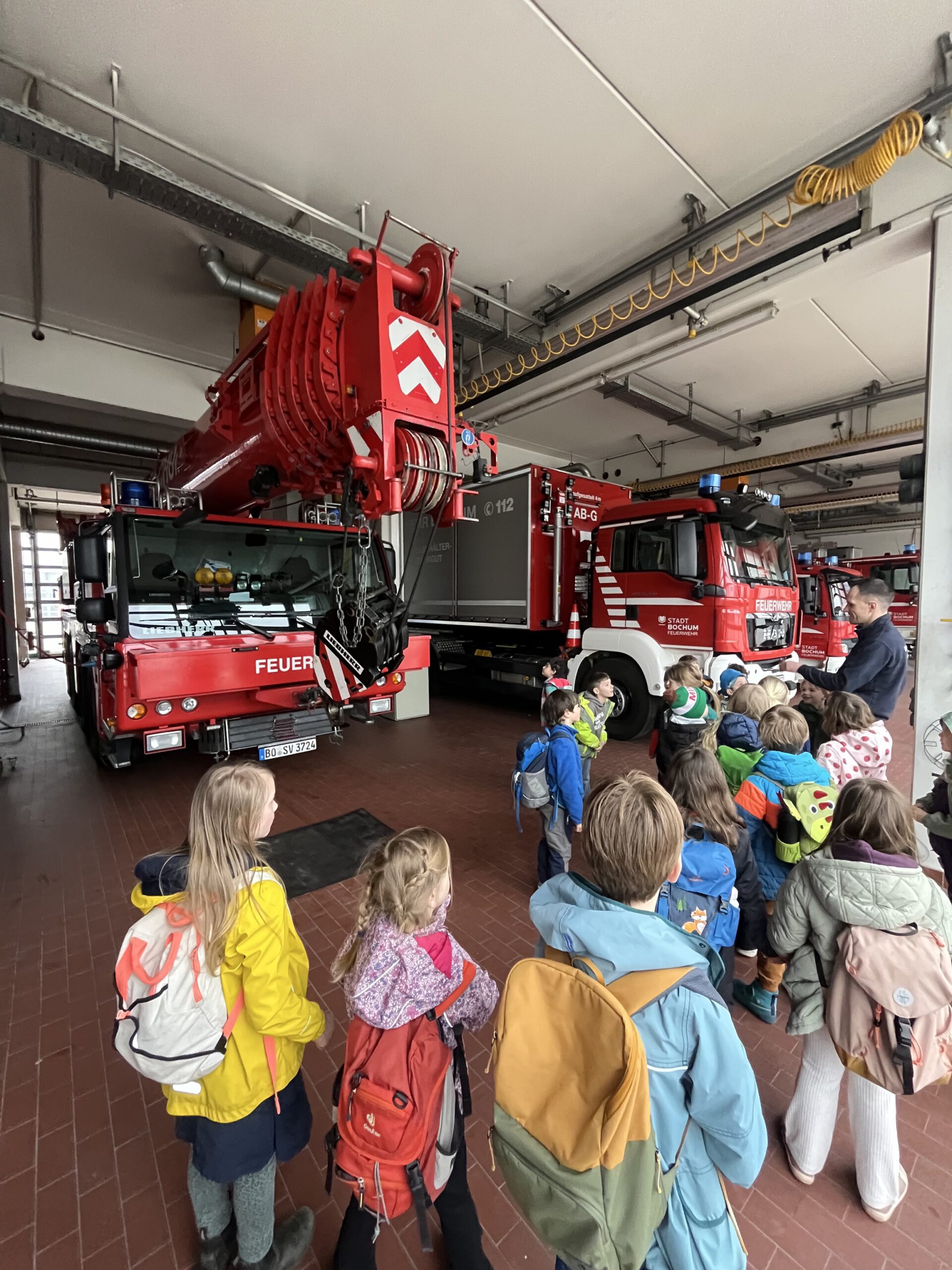 Die Wale aus der Klasse 1 haben vor den Ferien die Feuerwache besucht, in der ein Vater ihrer Klasse arbeitet. Gemeinsam mit Patrick sind sie durch die Meldestelle, die großen Hallen mit den Autos und durch die Feuerwehrautos selbst gelaufen.