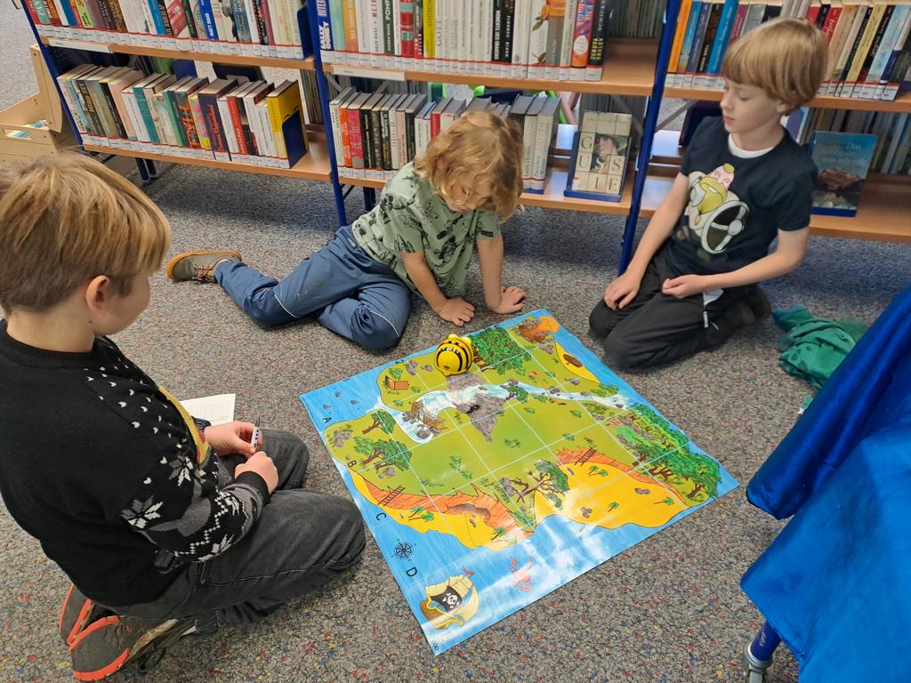 Kürzlich haben die Bienen aus Klasse 2 einen Ausflug in die Bücherei unternommen. Dort wurden sie von Beebots erwartet. Das sind kleine Roboterbienen, die es zu programmieren galt. Mit viel Spaß und Knobelei haben die Kinder gelernt, sich auf Landkarten und in Koordinatensystemen zu orientieren. Auf einer Schatzkarte durften sie dann die Beebots zu allen möglichen Zielen krabbeln lassen.